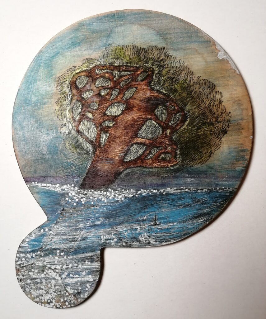 Muutos, 2023, huopakynä ja akvarellikynä puulle
