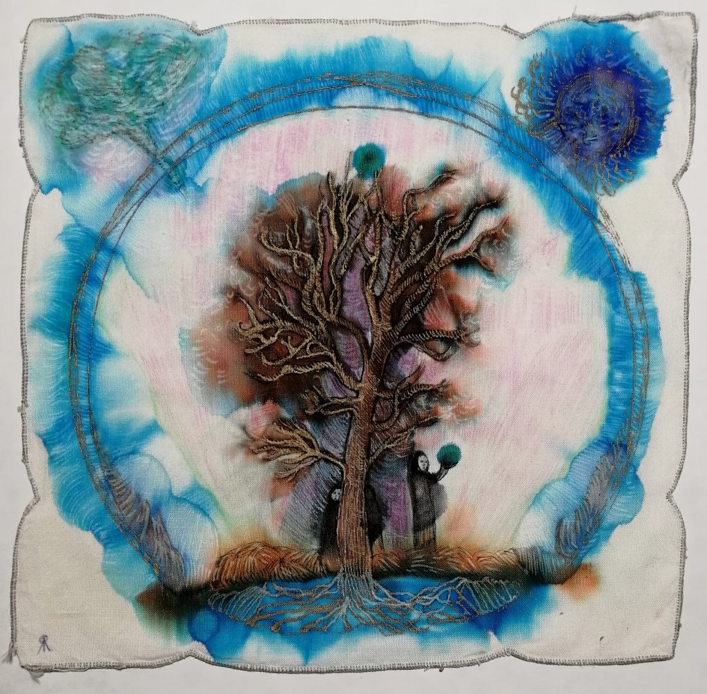 Tiedon puu, 2023, huopakynä ja puukynä kankaalle